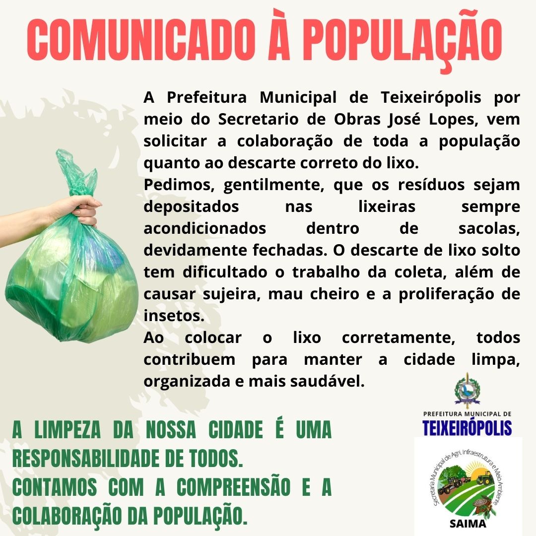 A Prefeitura Municipal de Teixeirópolis por meio do Secretario de Obras José Lopes, vem solicitar a colaboração de toda a população quanto ao descarte correto do lixo.