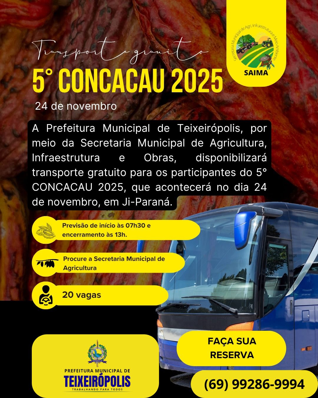 A Prefeitura Municipal de Teixeirópolis, por meio da Secretaria Municipal de Agricultura, Infraestrutura e Obras, informa que estará disponibilizando transporte gratuito para os participantes do 5º CONCACAU 2025, que será realizado no dia 24 de novembro, em Ji-Paraná.