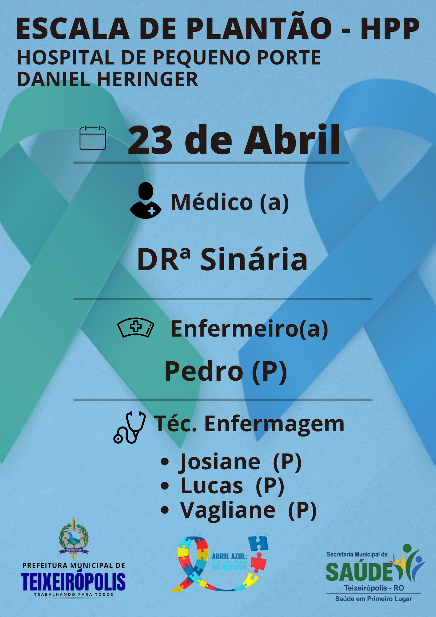 Escala de Plantão – HPP Daniel Heringer Data: 23 de abril Médica: Drª Sinária Enfermeiro: Pedro Técnicos de Enfermagem:• Josiane• Lucas• VaglianeSeguimos trabalhando para cuidar de você e da sua família!